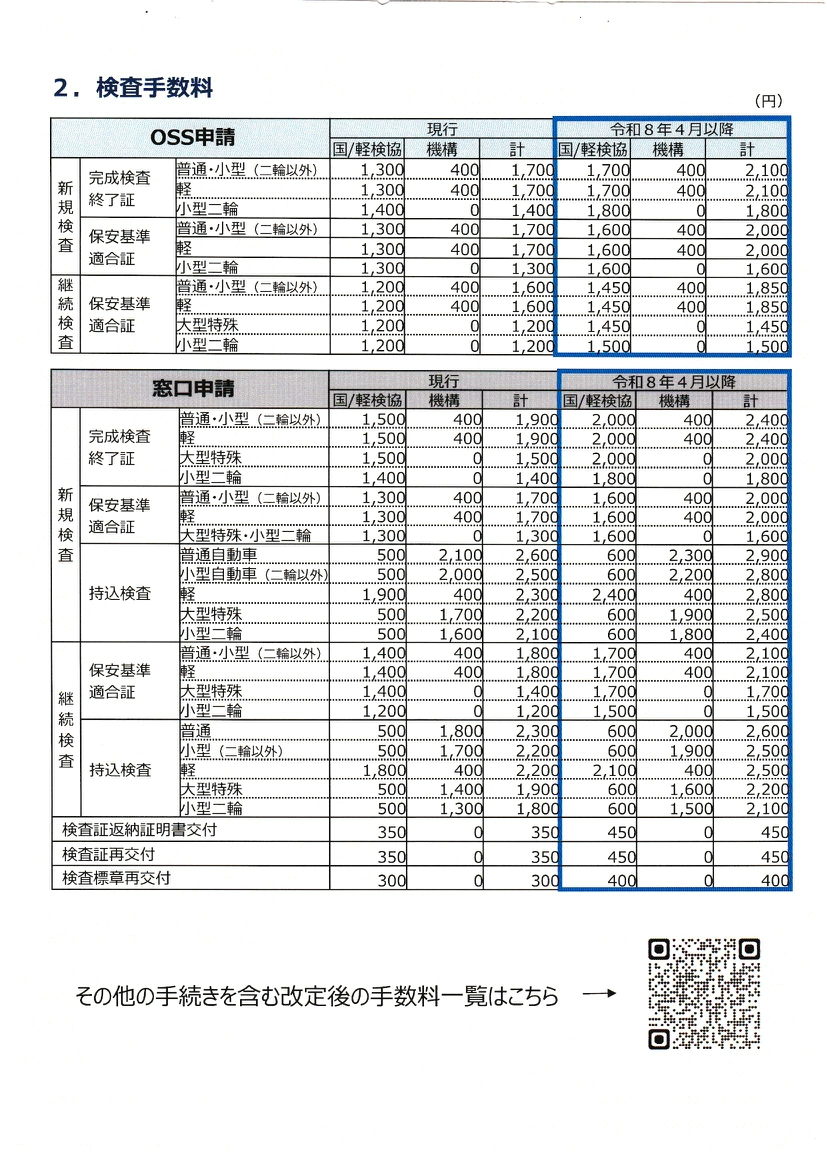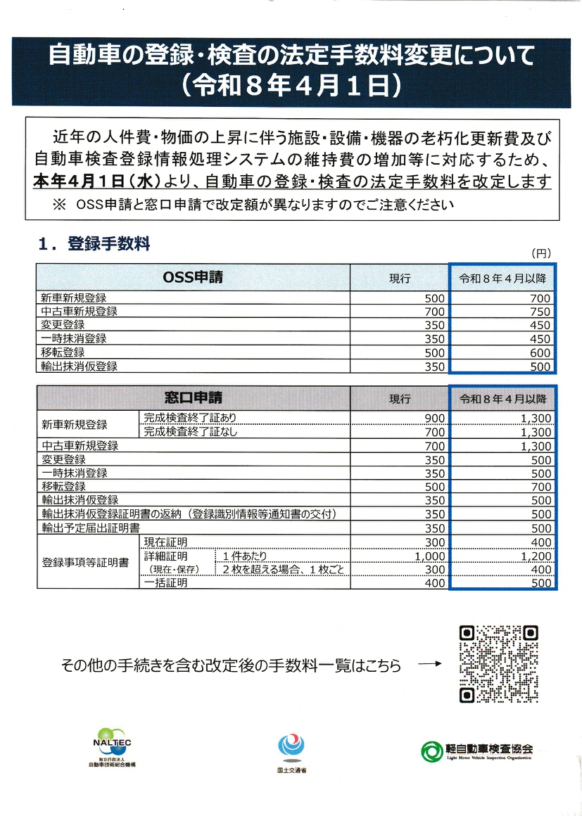 令和8年4月1日より…自動車検査・登録手数料の改定が行われます! 2026年03月25日 新着情報 一般 会員 来たる4月1日(水)より下記の通り、自動車検査・登録にまつわる手数料の改定が実施されますのでお知らせ致します。